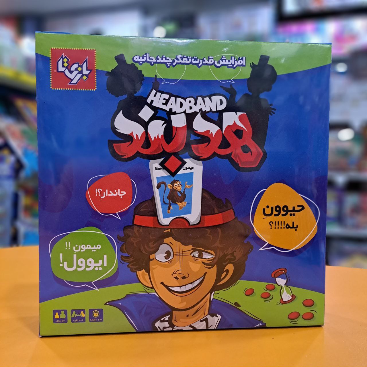 یک بازی شاد و مهیج گروهی است که می توان بصورت 2 تا 6 نفره بازی کرد. این بازی مناسب گروه سنی 6 سال به بالامی باشد. محتویات این محصول 60 کارت، 6 هدبند پلاستیکی، 8 سکه امتیاز و ساعت شنی است. روش بازی هدبند اینگونه است که کارت ها را ببن بازیکنان تقسیم کرده بصورتی که هیچ یک روی کارت‌ها را نبینند. سپس بازیکن اول هدبند را بر سر خود می‌بندد و یکی از بازیکنان کارتی به هدبند او می‌گذارد. بازیکن با توجه به سوالاتی که از دیگر بازیکنان می پرسد و راهنمایی آنان با جواب بله یا خیر او را به جواب تصویر نزدیک می کنند. از قسمت  مهیج این بازی داشتن ساعت شنی است که بازیکن باید در زمان مشخص جواب را پیدا کند.