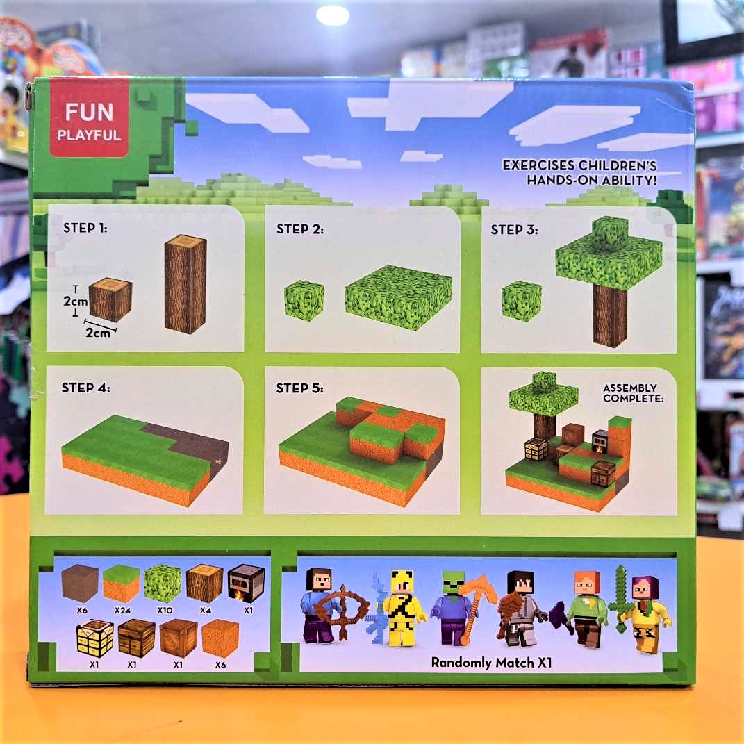 قطعات بازی شامل طرحهایی از چمن، خاک، چوب، صندوق گنج، آتش و درخت هستند و به بچهها حس بازی واقعی ماینکرفت را منتقل میکند.